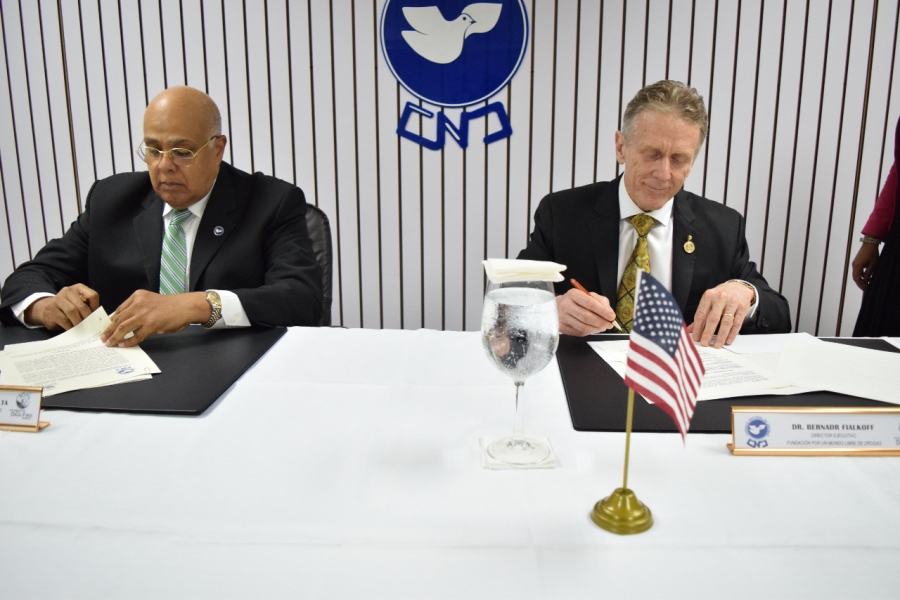 A través del convenio, ambas instituciones representadas por el licenciado Rafael Guerrero Peralta, presidente del Consejo Nacional de Drogas, y el doctor Bernard Fialkoff, Director Ejecutivo de la Fundación Por un Mundo Libre de Drogas, asumen el compromiso de llevar mensajes preventivos a clubes, escuelas y universidades de todo el país.