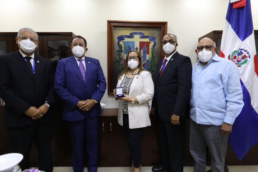 Durante el encuentro de coordinación de acciones preventivas, el presidente del CND colocó el pin que acredita a la señora Santos, gobernadora provincial de Santiago, como asesora honorífica de ese organismo.